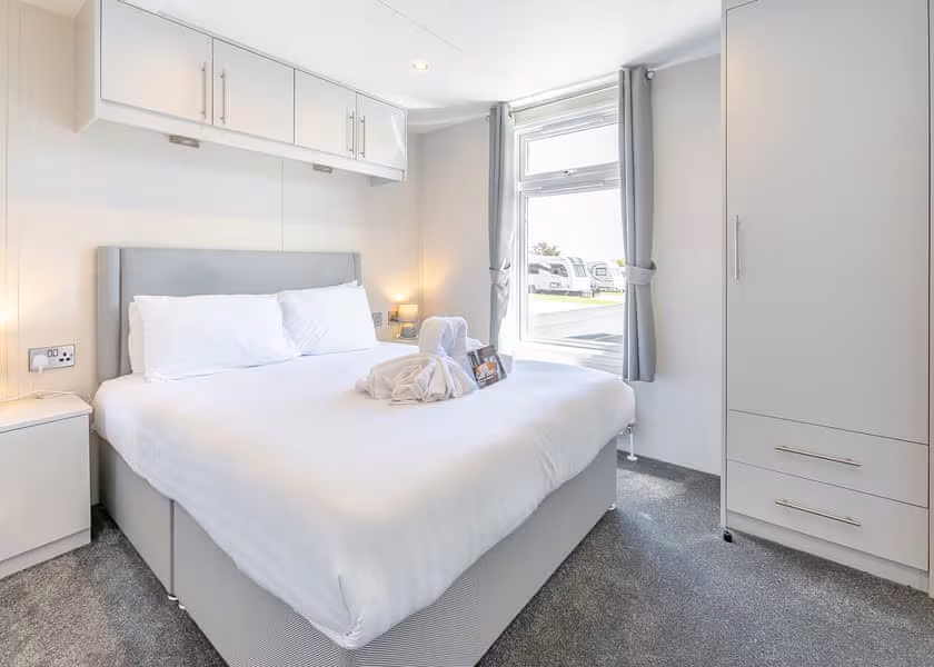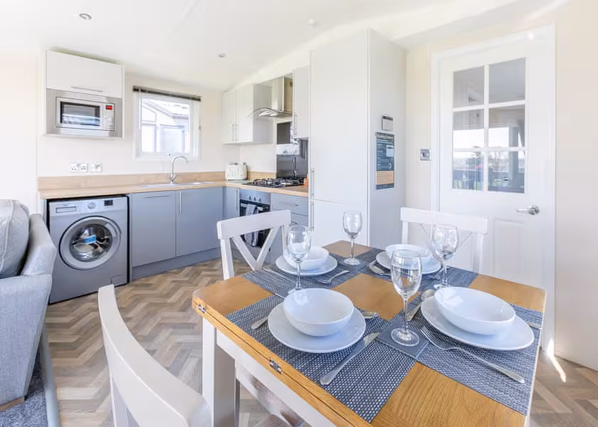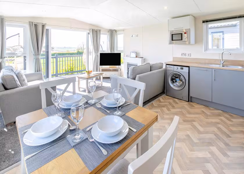 Enter the lounge and kitchen area and be enveloped by natural light and the expansive width of the holiday home. The dining area features an extendable table, ideal for hosting delightful meals with friends and family. The fully equipped kitchen is a chef’s dream, complete with built-in fridge freezer, electric oven, 5-burner hob, dishwasher, and washing machine. Oak laminated worktops and sleek grey kitchen cupboards add a touch of class and modern elegance.
