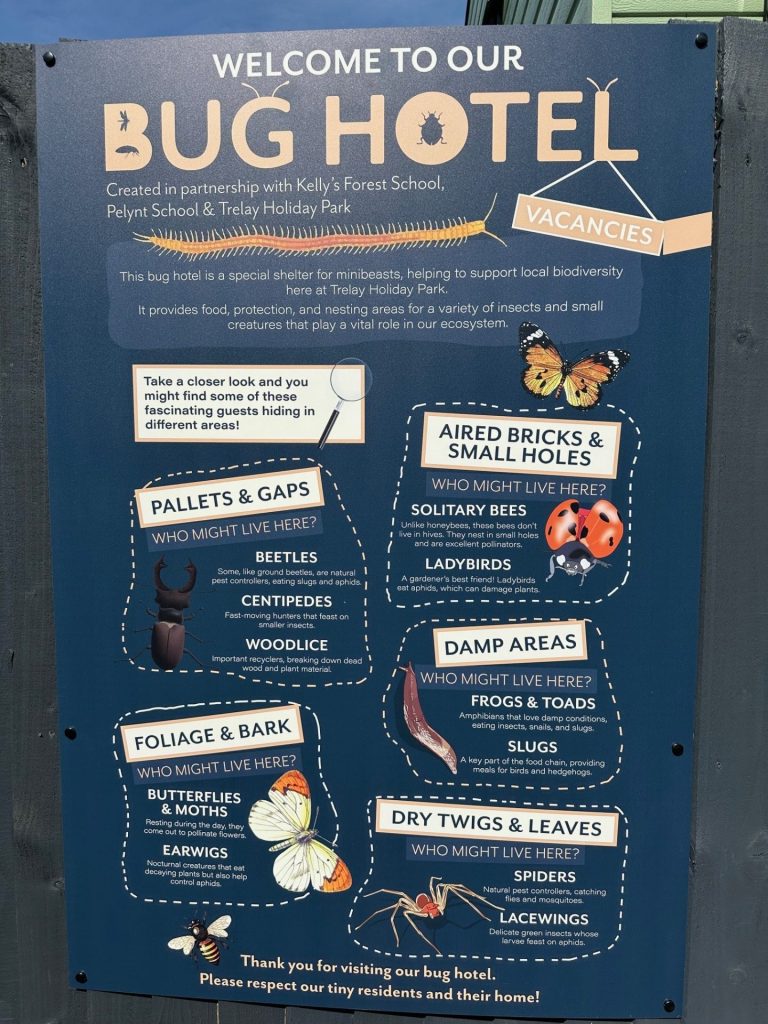 We’re thrilled to unveil a fantastic new feature at Trelay Holiday Park – the Hideaway Bug Hotel! This imaginative and eco-friendly structure was proudly created by the talented children of Pelynt Primary School, in collaboration with the wonderful team at Kelly’s Forest School.